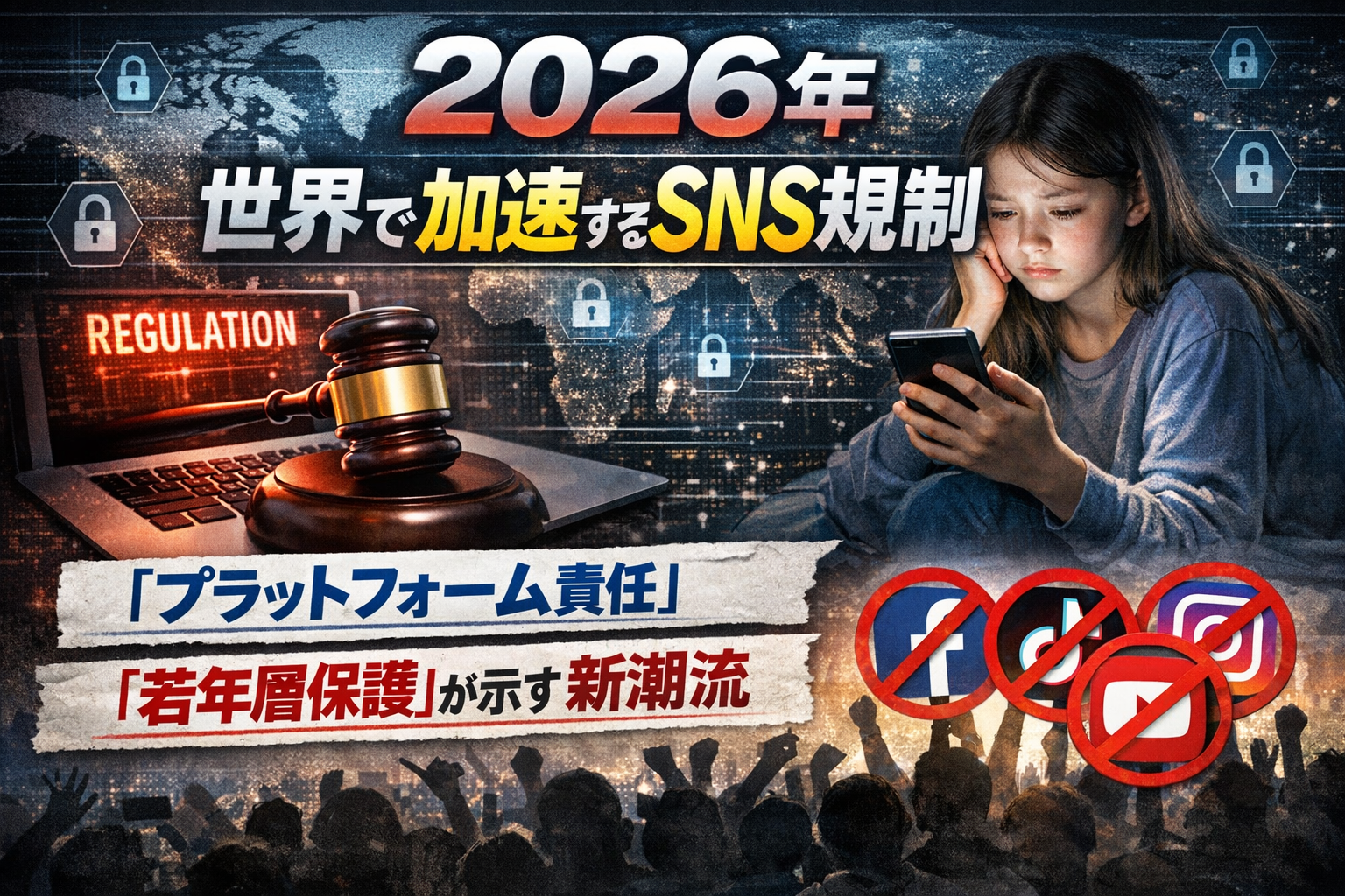 記事 2026年 世界で加速するSNS規制「プラットフォーム責任」と「若年層保護」が示す新潮流 2026年現在、SNSをめぐる法規制は大きな転換点を迎えています。その背景にあるキーワードは、①プラットフォームの責任強化と②若年層の保護。世界の主要国・地域では、社会的影響力が増したSNSのリスクに対応するため、かつてないスピードで法整備... 2026.01.04 記事