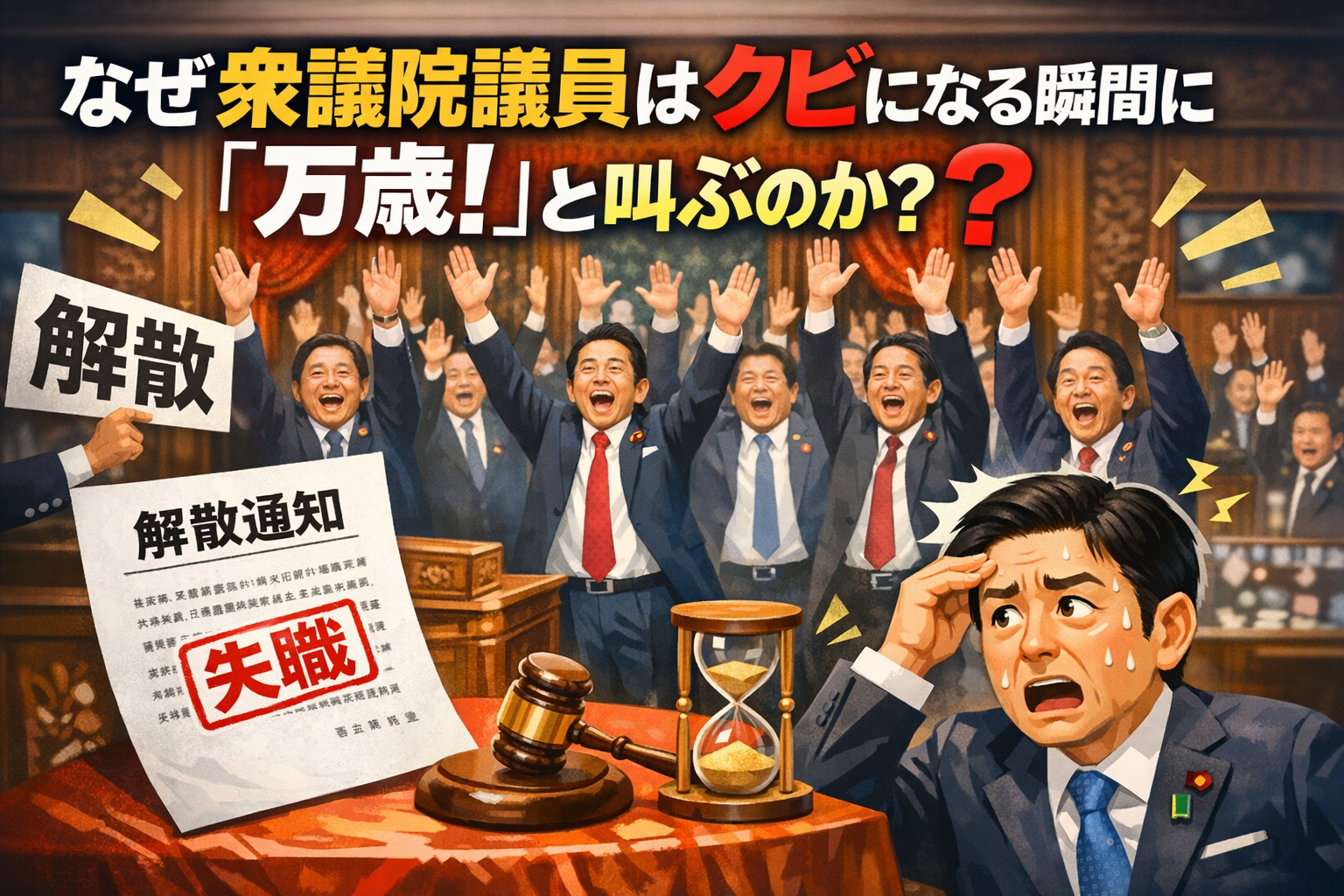 記事 【謎】なぜ衆議院議員はクビになる瞬間に「万歳!」と叫ぶのか? ニュースでよく見る、衆議院解散のあの光景。 議長が「衆議院を解散する!」と宣言した直後、議員たちが一斉に両手を挙げて「万歳!万歳!万歳!」。冷静に考えると、これって不思議だと思いませんか? だって、彼らはその瞬間に全員「失職」して、タダの人... 2026.01.11 記事
