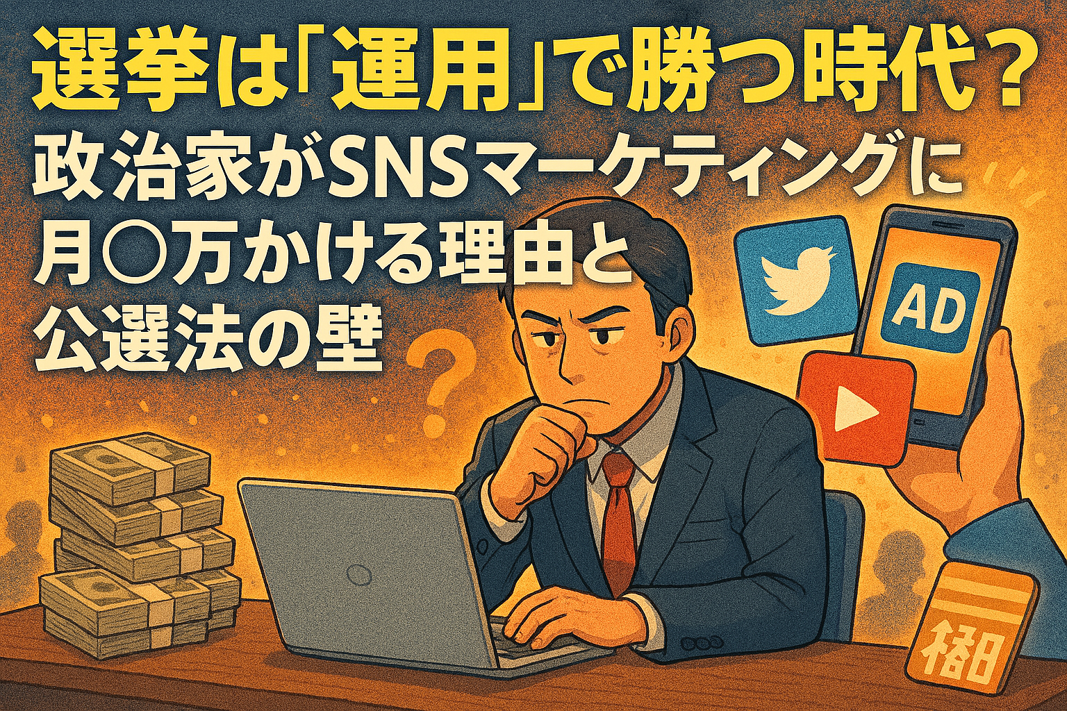記事 選挙は「運用」で勝つ時代?政治家がSNSマーケティングに月◯万かける理由と公選法の壁 2026年現在、街頭演説の熱気以上に選挙結果を左右すると言われているのが、スマートフォンの中の「SNS戦術」です。新人から現職まで、多くの政治家がSNS運用に月数十万円の予算を投じるのはなぜか?そこには、「法律で禁止されているネット広告」に... 2026.01.18 記事